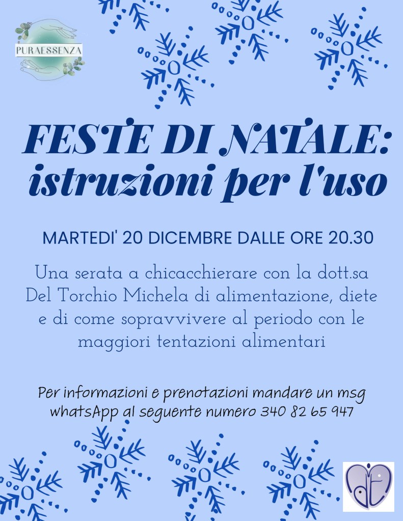 Una serata per parlare di alimentazione, diete e come sopravvivere a questo periodo pieno di tentazioni. Potete scrivermi un msg su WhatsApp, sia per prenotare che per chiedere maggiori info. Vi aspetto numerosi!!!!