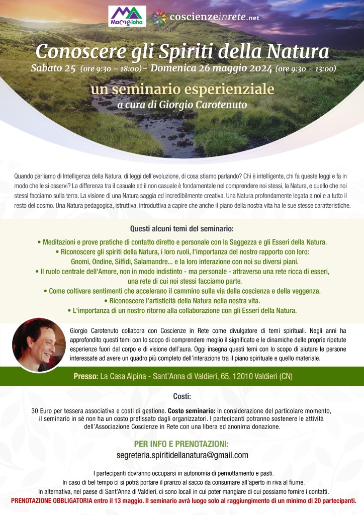 Il primo è un incontro di due giorni con Giorgio Carotenuto presso la Casa Alpina di Sant’Anna di Valdieri, per entrare in contatto con gli spiriti della Natura, quali sono, dove si trovano e come vederli.