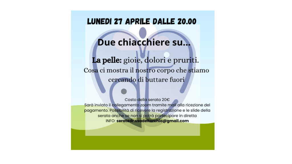 Lunedì 27 aprile su zoom parleremo degli aspetti emozionali e alimentari legati ai disturbi della pelle. Scrivimi per avere maggiori informazioni e per preiscriverti alla serata|